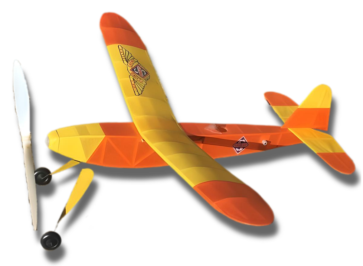 This free flight rubber powered model airplane kit includes a full-size rolled plan, laser cut balsa parts and hand-picked balsa strip wood, Easy Built Lite tissue in a variety of bright colors, FAI rubber motor, E-B propeller, EBM thrust bearing, wheels, wire, clear plastic for the windshield, and 1 pair of Jimmie Allen TissueCal™ markings. To build this model you will need a building board, hobby knife, fine sandpaper, and glue.