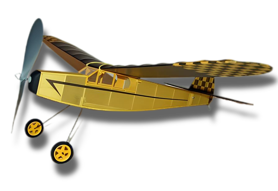 This free flight rubber powered kit contains a full-size rolled plan, laser cut balsa parts, balsa stripwood, rubber motor, E-B propeller, EBM thrust bearing, clear plastic for the windshield, wheels, landing gear wire, and Easy Built Lite tissue in a variety of bright colors. To build this model you will need a building board set, hobby knife, fine sandpaper, and glue.