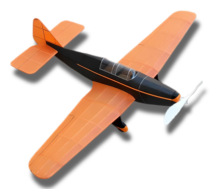 This free flight rubber powered kit contains a full-size rolled plan, hand-picked printed balsa and balsa strip wood, rubber motor, E-B propeller, EBM thrust bearing, clear plastic for the windshield, wheels, landing gear wire, and Easy Built Lite tissue in black and orange. To build this model you will need a building board, hobby knife, fine sandpaper, and glue.