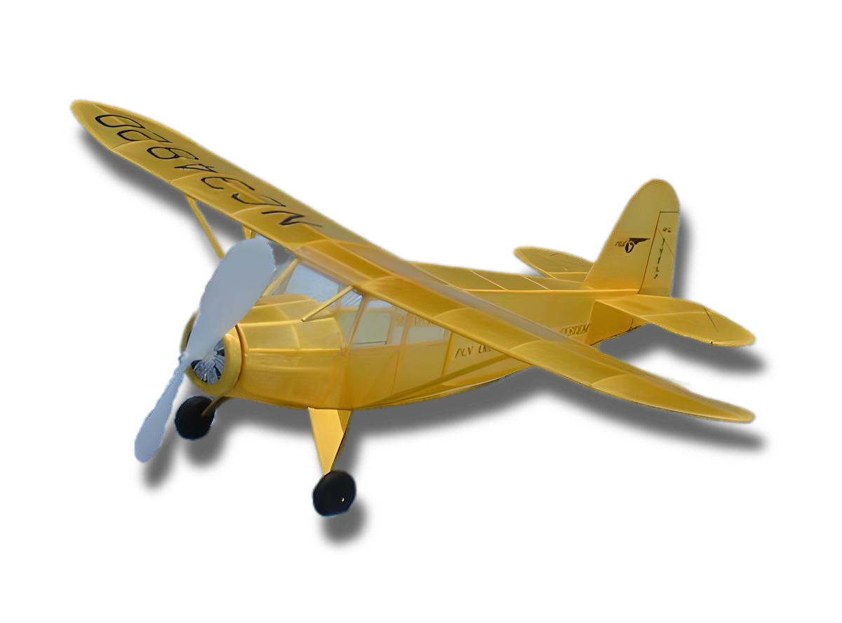 This free flight rubber powered kit contains a full-size rolled plan, printed balsa and hand-picked balsa strip wood, clear plastic for the windshield, rubber motor, E-B propeller, EBM thrust bearing, wheels, wire, and black and yellow Easy Built Lite tissue. To build this model you will need a building board, hobby knife, fine sandpaper, and glue.