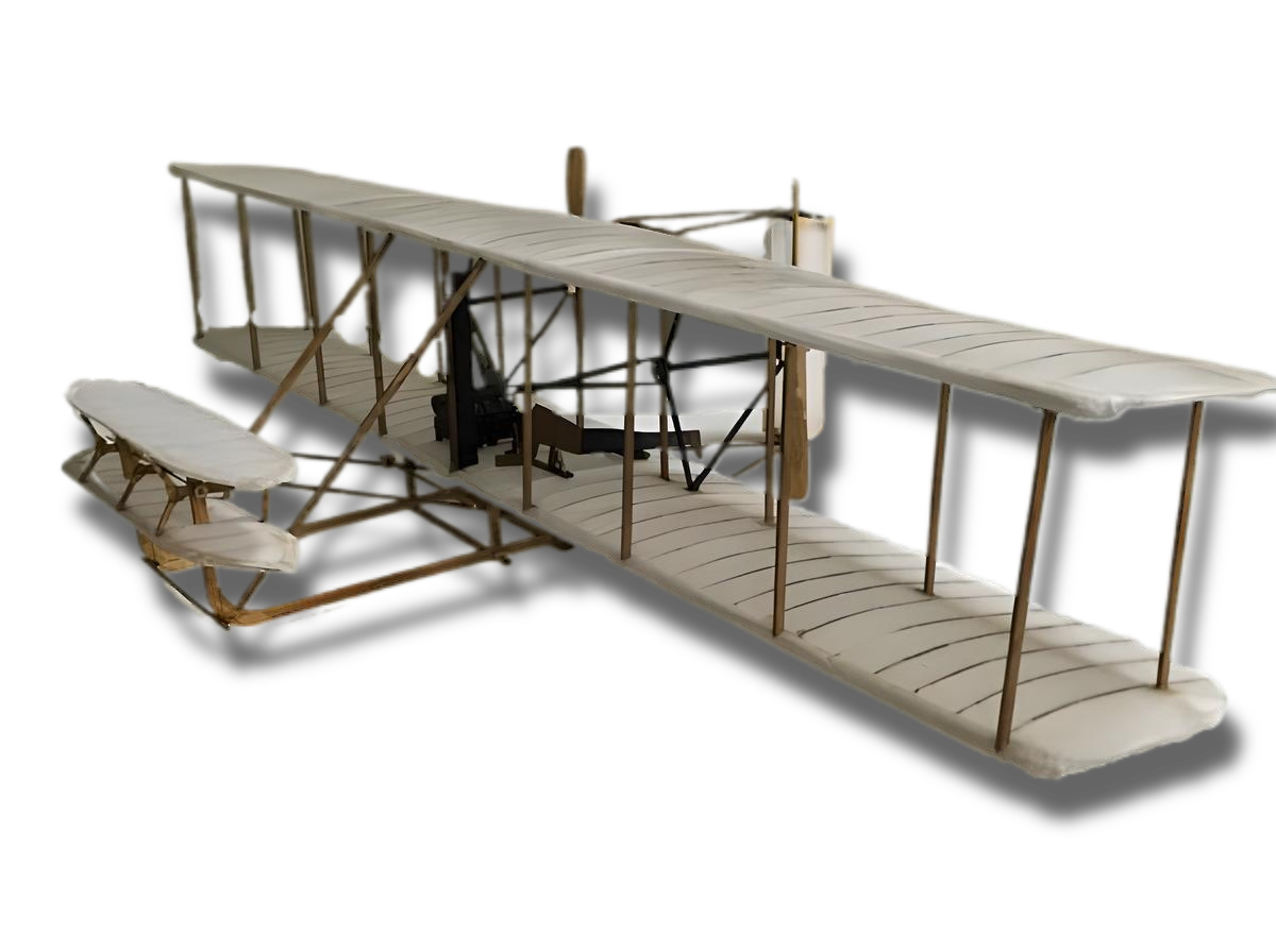 This 1:20 scale model kit of the first engine-powered flying machine to make a successful flight commemorates the dawn of powered flight. On December 17, 1903 Orville Wright launched the Wright Flyer I from a sand dune known as Big Kill Devil Hill near Kitty Hawk, North Carolina. The flight lasted 12 seconds and a distance of 120 feet. The Wright Flyer I was the culmination of years of research and testing during which brothers Orville and Wilbur Wright designed and built all the components of the Flyer including the propellers and engine.
