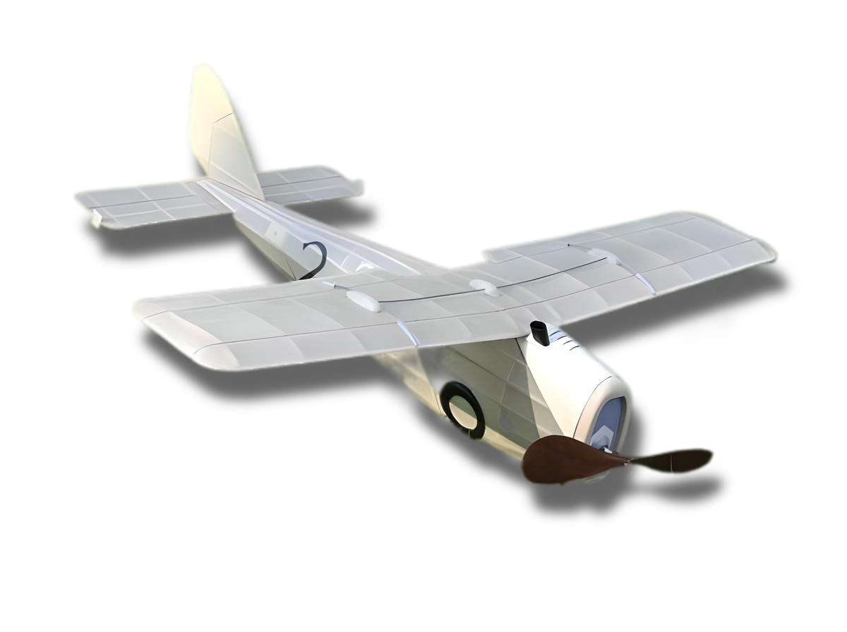 This free flight rubber powered kit includes a full-size rolled CAD drawn plan, laser cut balsa parts, hand-picked balsa strip wood, vacuum-molded wheels and control covers, FAI rubber motor, E-B propeller, EBM thrust bearing, LaserCal™ laser cut markings, and MT. FUJI grey Japanese tissue. To build this model you will need a building board set, hobby knife, fine sandpaper, and glue.